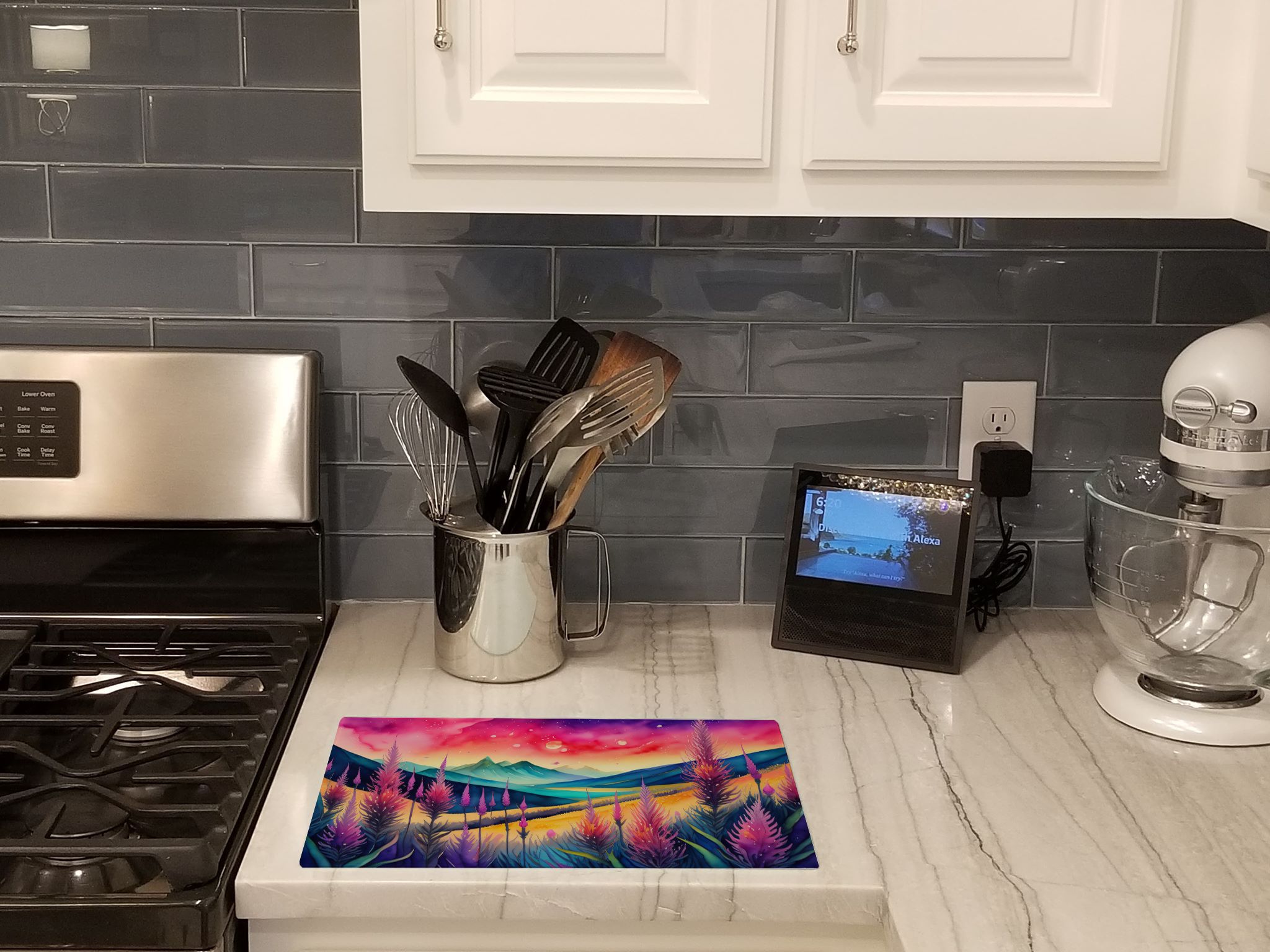 1.Vibrant Artwork Design: Elevate your kitchen aesthetics with our Decorative Glass Cutting Board, showcasing unique and colorful artwork from celebrated artists. An ideal fusion of functionality and style, perfect for modern kitchen decors.