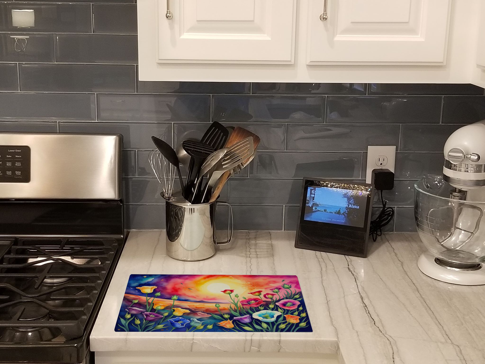 Introduce your kitchen to the vibrant, large Decorative Glass Cutting Board from Caroline's Treasures. Crafted from resilient tempered glass, this board is not only a utilitarian necessity but also a colorful art piece. With its generous dimensions of 15 inches in height and 12 inches in length, it offers ample space for all your cutting needs. Every piece showcases captivating artwork from distinguished artists, bringing an aesthetic edge to your kitchen. Beyond its attractive design, this cutting board ensures your countertop stays pristine and unscathed, owing to its heat-resistant properties. Engineered with user convenience in mind, it features non-skid feet for stability, and rounded corners for additional safety. Its robust construction renders it virtually unbreakable, guaranteeing longevity. The board comes with protective feet bumpers, maintaining its position during use. This product is recommended to be hand washed only. Proudly printed and assembled in the United States, this cutting board exemplifies superior craftsmanship. With Caroline's Treasures' Decorative Glass Cutting Board, you're investing in a blend of functionality and artistic flair.